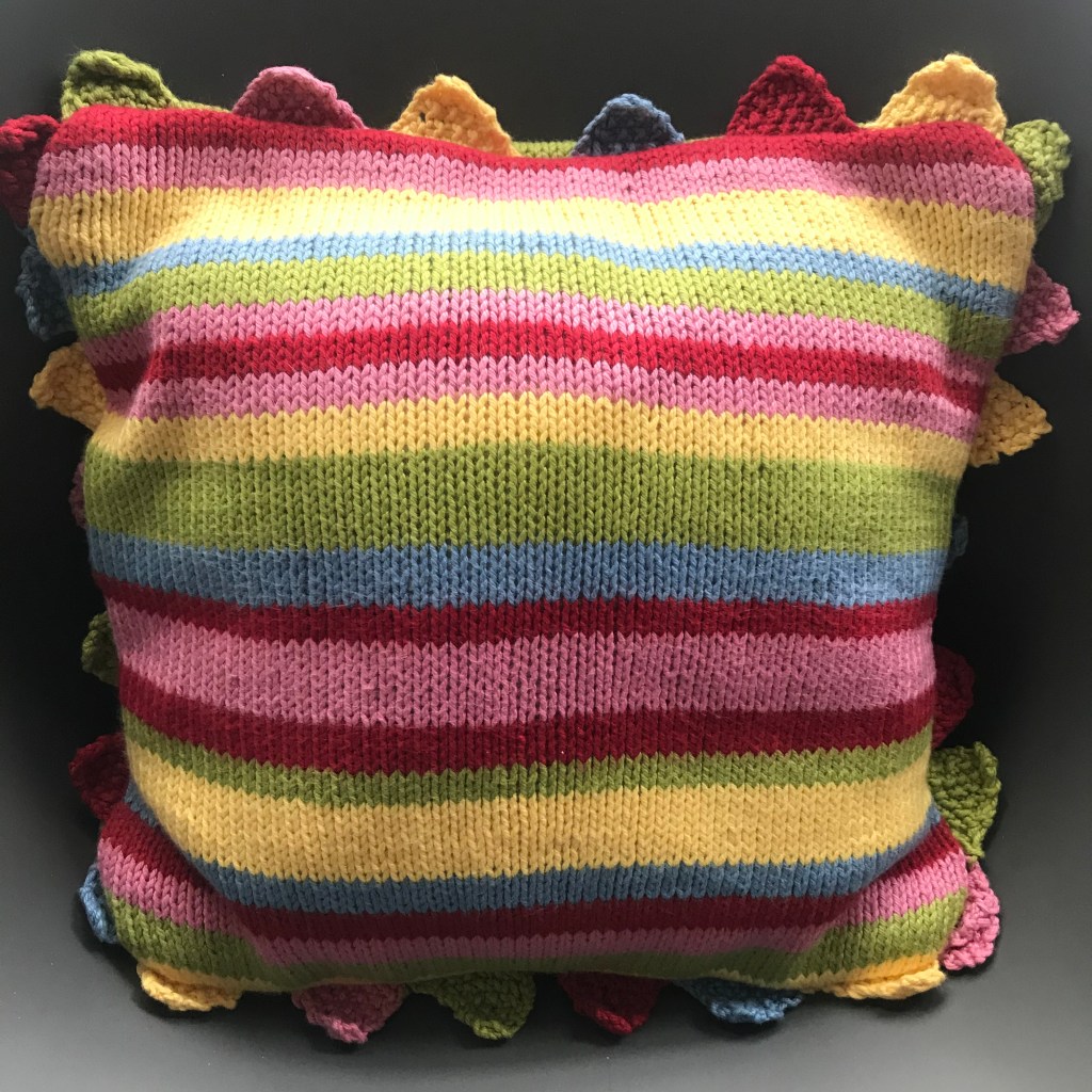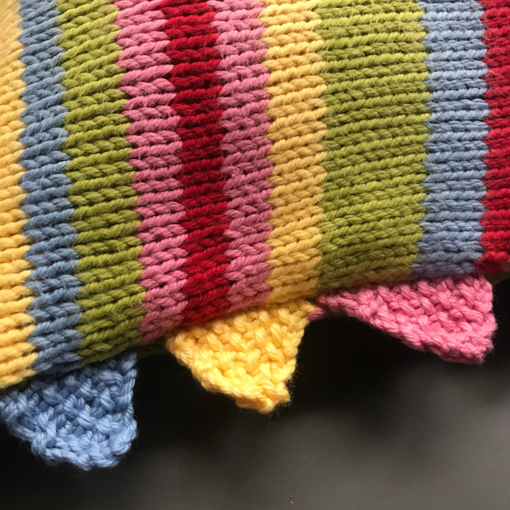This project has taken me many years to finish. I guess I am a faddy person because I find that I start projects and then move on when something new and exciting comes along! Back in November 2020, I posted some images on Instagram of a couple of projects that I wanted to resurrect and finish. One of them was this stripy cushion. The other was a colour-block throw (I’m now approaching half-way on the throw project!). I was inspired to start knitting again by my good friend Victoria of Nelvana Knitting.