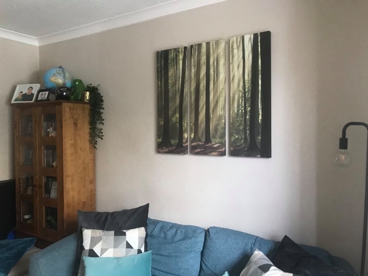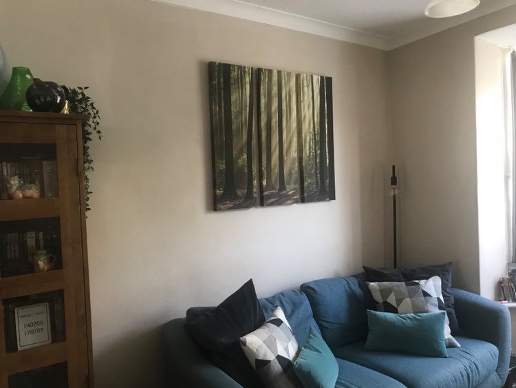 The original wall art on the wall behind the sofa was a set of three canvases of woodland trees from NEXT, which when spaced apart, make a larger image. I still like this composition and will keep them in case I can use them in another space. Here are a couple of images of the wall with those canvases.