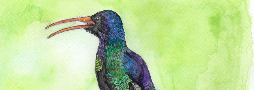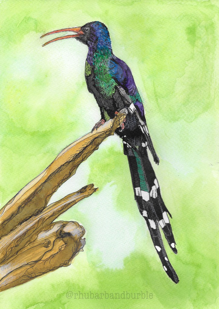 Most people are probably familiar with the orange coloured hoopoe with the amazing crown of feathers. I thought I’d find out if there were any other types of hoopoe and discovered the green wood hoopoe. I loved the rich greens and blues in the plumage, so plumped for this as my subject.