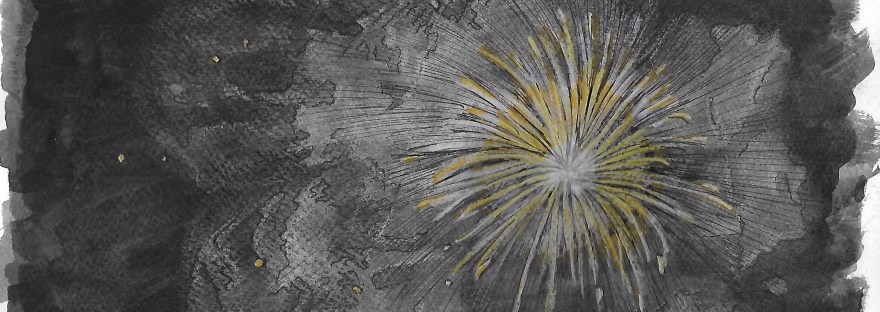 I went back to my original backgound and used the chinagraph pencil instead. It worked fairly well over top, but is quite dull in comparison to the star and shooting star effect I achieved using bleach on An inky night sky. To compensate, I used some yellow acrylic ink to make it more golden in colour. I used the fineliner to extend the light burst and drew around the edges of the clouds where the pooled ink had dried, then highlighted them with the chinagraph pencil. I am actually quite pleased with the final result, albeit the firework is not very bright.