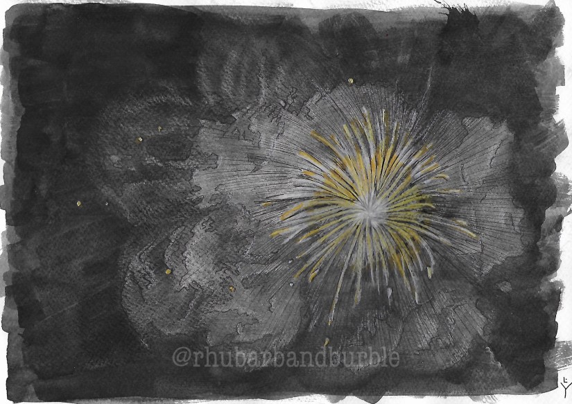 Unfortunately, the bleaching technique which worked with the fountain pen ink, did not work with the indian ink. I decided to start again and this time around I tried the wax resist technique. However, that it didn’t really work because my firework was a bit pathetic! (I couldn’t really see where I had laid down the clear wax crayon.)