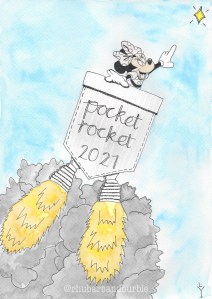 This illustration was inspired by the Artful Box theme A pocket with personality from Saturday 26th December 2020. I sketched the design with a pencil and drew the black lines using a fineliner. The watercolours are acrylic inks and the smoke is indian ink. I know that the phrase pocket rocket can have sexual connotations, but this interpretation is along the lines of a small feisty girl. My first thought was Minnie Mouse for some reason(!), as well as a pocket being a literal rocket!