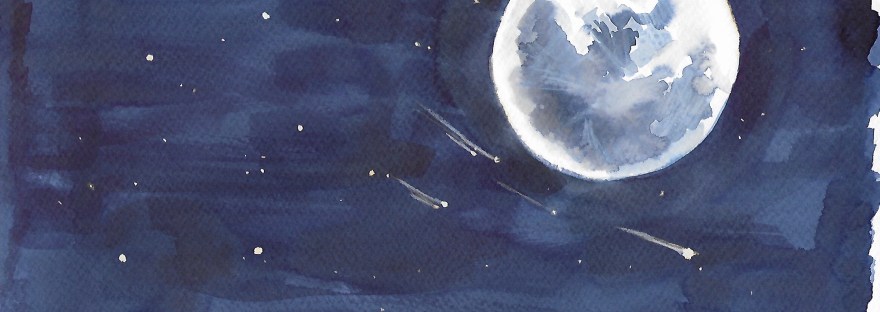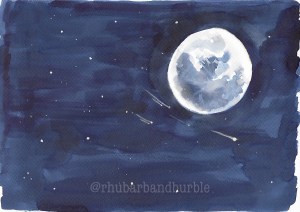 I was keen to use the fountain pen ink and bleach technique again and this night sky had lots of stars! The bleach is hard to control and often bleeds into the ink more than I would like. To achieve as small a point as I could, I cut off all but a couple of hairs from a fine paintbrush, but it’s still tricky. If anybody has found a more precise way of dotting the bleach on, I would be grateful if you could let me know in the comments below.
